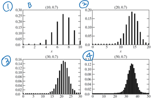 n에 따른 이항 분포의 모양입니다. n이 커질수록 모양이 정규 분포와 가까워 집니다.