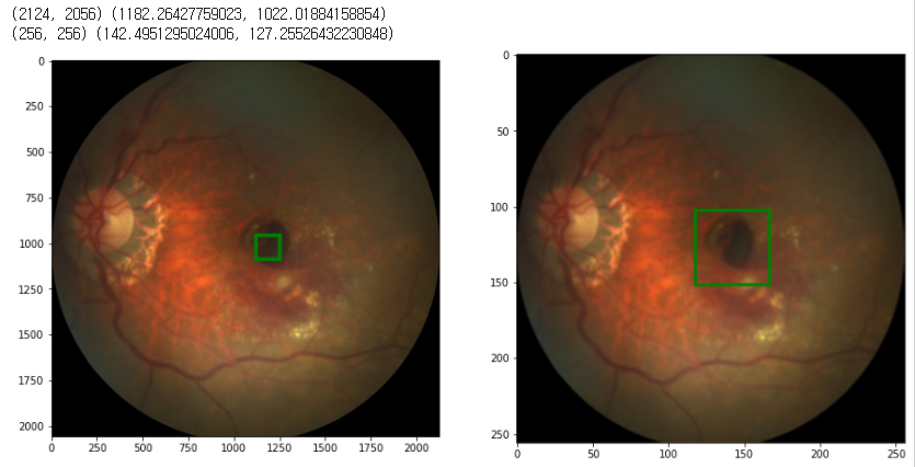 AMD dataset은 AMD, Non-AMD 두 종류의 이미지가 있으며 크기가 다릅니다. 크기를 256x256으로 고정시키고, 그에 따라 바운딩박스의 중심 좌표(label)도 갱신시키는 함수를 정의해보겠습니다.