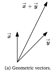 고등학생 때 배웠던 친숙한 벡터입니다. 기하학적인 벡터는 방향과 크기를 설명하기 위해 사용됩니다. 위 그림에서 두 벡터는 서로 더해져 또 다른 기하학적인 벡터를 만들어내고, 스칼라와 곱해져도 기하학적인 벡터입니다. 곱셈과 덧셈에 닫혀있으므로 벡터입니다.