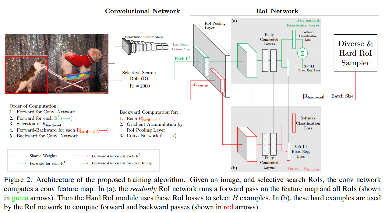 8. $R_{hard-set}$을 regular RoI networ에 전달하여 object detection을 수행합니다. detection 수행 방식은 기존의 Fast R-CNN과 동일합니다. 차이점은 readonly network가 추가되어 hard RoI를 샘플링 하는 것입니다.