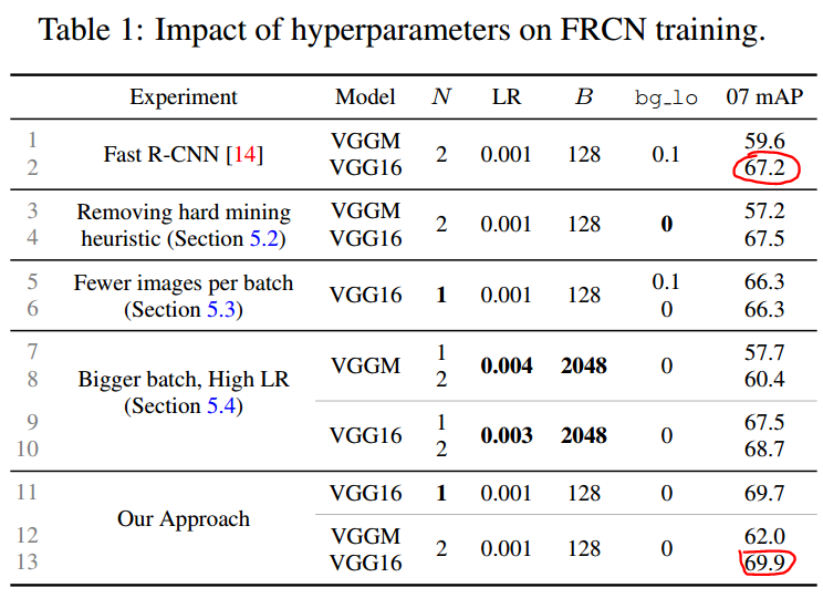 PASCAL VOC07 dataset로 학습된 Fast R-CNN의 mAP는 67.2%입니다. 여기에 OHEM을 적용하여 mAP을 69.9%로 향상시켰습니다.