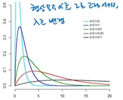 감마분포는 알파와 감마, 두 가지 모수가 존재하며, 알파를 형상모수(shape parameter), 람다를 척도모수(scale parameter)이라고 합니다.