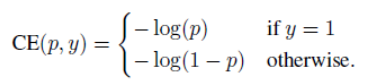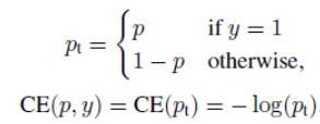 위 식은 이진 분류문제에서 사용하는 CE loss function입니다. y는 ground-truth class이고, p는 모델이 예측한 값입니다. 편리함을 위해 아래와 같이 간단히 표현하겠습니다.