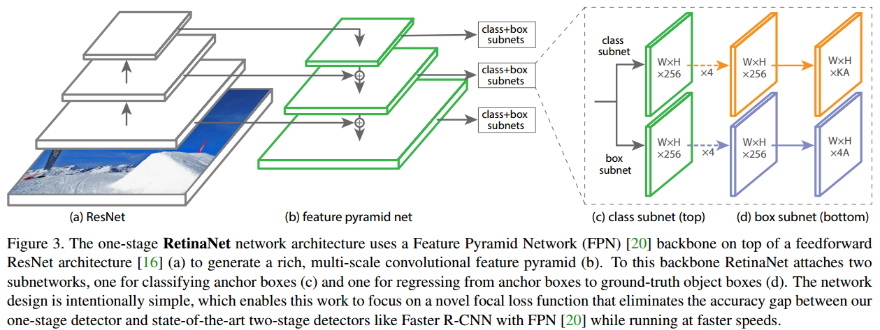 RetinaNet은 ResNet-FPN을 backnone으로 하여 2개의 sub-network를 사용하는 신경망입니다. 첫 번째 sub-network는 object classification을 수행하고, 두 번째 sub-network는 bounding box regression을 수행합니다. 전체적인 구조는 아래 그림과 같습니다.