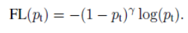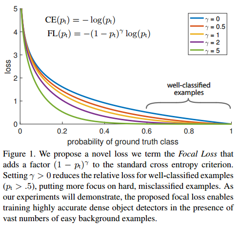 $\gamma$는 하이퍼파라미터입니다. 감마값으로 easy/hard example의 가중치를 조절할 수 있습니다. 논문에서는 $\gamma$=2 일때, 가장 성능이 좋다고 합니다.