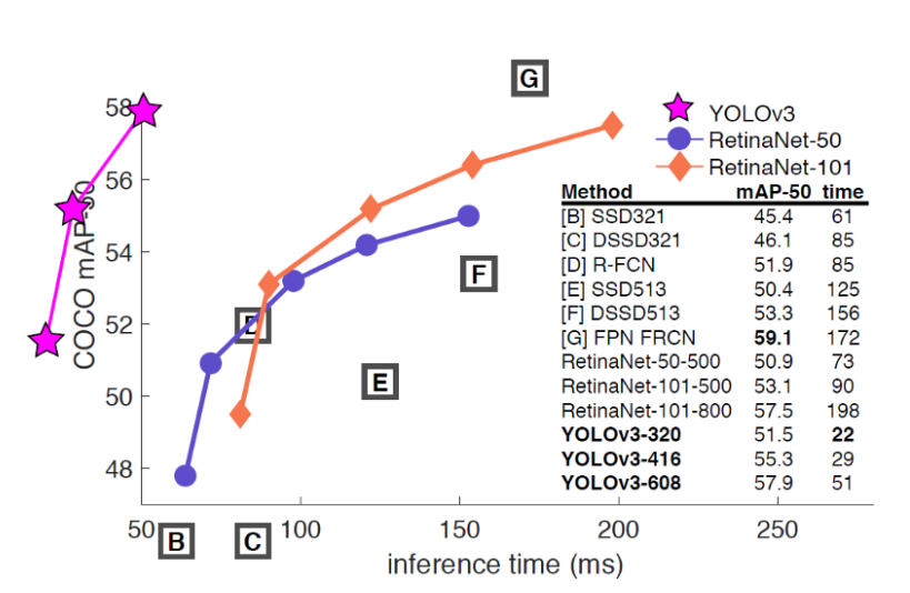 YOLOv3은 mAP@0.5로 평가했을 때 성능이 월등히 좋습니다.
