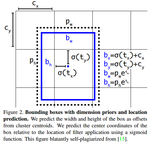 YOLOv3에서 bounding box를 예측하는 방법은 YOLOv2와 동일합니다. tx, ty, tw, th가 예측됩니다. 예측된 tx, ty는 시그모이드 함수를 거쳐서 범위가 0~1으로 제한됩니다. 그리고 cx, cy와 더해져 바운딩박스가 됩니다 cx, cy는 객체를 포함하고 있는 grid cell의 좌표입니다. tw, th는 지수승로 사용되어 pw, ph와 곱해집니다. pw, ph는 이전 바운딩박스의 너비와 높이입니다. 이처럼 다양한 정규화 기법으로 바운딩박스가 한번에 업데이트 되는 범위를 제한하여 학습이 안정적으로 되게 합니다.(YOLOv2에 자세한 내용이 나와있습니다.) 학습동안 SSE(sum of squared error loss)를 사용합니다.