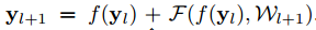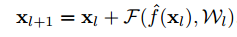 h는 identity mapping, F는 residual function(convolution layer를 거칩니다.), xl은 입력값, xl+1은 출력값, f는 활성화 함수, W는 가중치를 의미합니다.