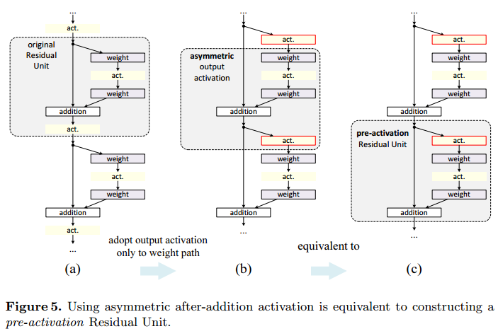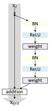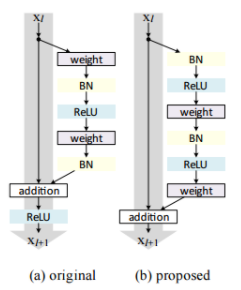 기존 ResNet에서는 f를 ReLU 함수와 BN을 사용합니다. 이 활성화 함수(ReLU와 BN)의 위치를 바꿔준다면 f를 identity mapping으로 만들 수 있습니다.