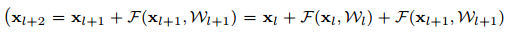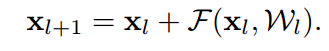 한번의 Residual block을 거치면 위 수식이 계산되어 xl+1이 생성되는 것입니다.