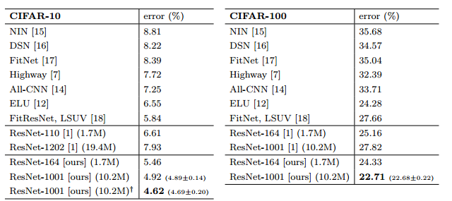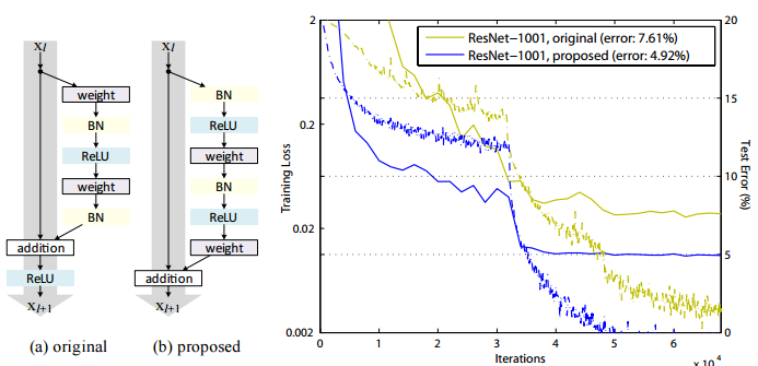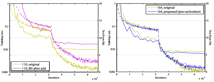 위 그림을 보면 수렴지점에서 pre-activation 구조의 training loss가 original보다 높습니다. 반면에 test error가 낮은 것은 overfitting을 방지하는 효과가 있다는 것을 의미합니다.