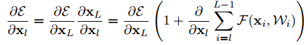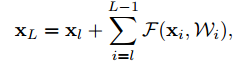 여러 Residual block을 거친다면 위 식은 일반화 되어 다음과 같이 표현할 수 있습니다.