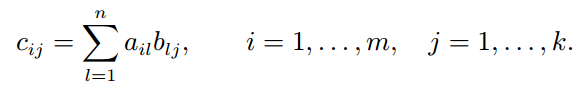 행렬 곱셈은 element-wise operation으로 정의되지 않습니다. (mxn) 크기의 A행렬과 (nxk)크기의 B행렬을 곱한 C 행렬의 요소는 다음과 같이 구할 수 있습니다.