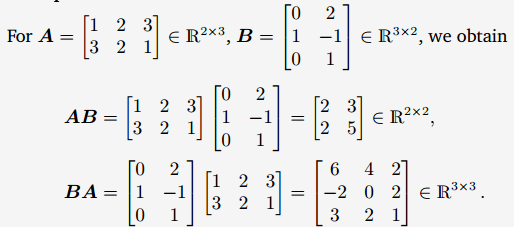 행렬 곱셈은 가환성을 만족하지 않습니다. AB != BA 입니다.