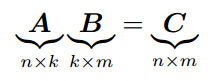 행렬 곱셈을 하기 위해서는 'neighboring' 차원이 같아야 합니다. 예를 들어 nxk 크기의 행렬 A는 kxm크기의 행렬 B과 곱해질 수 있습니다.