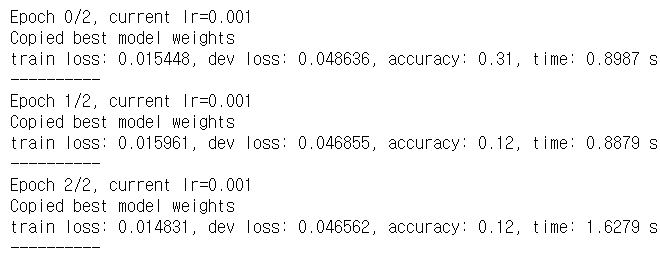 loss가 낮은 이유는 1epoch당 1 mini-batch를 계산하도록 설정했기 때문입니다. 전체 로스는 데이터셋 수로 나눠주므로 낮은 수가 나올 수 밖에 없습니다. 정확도는 0.31%인 것으로 보아 모델이 거의 예측을 못하고 있네요...ㅋㅋ 아마 400 epoch정도 학습시켜주면 수렴하지 않을까.... 생각하고 있습니다!