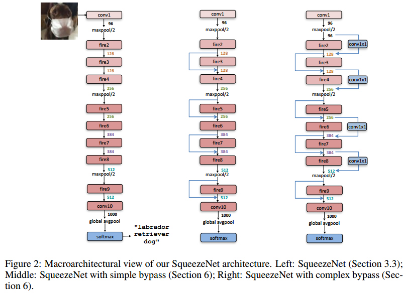 3가지 SqueezeNet의 구조입니다. 첫 번째는 기본 구조 입니다. 두 번째는 기본 구조에 simple bypass가 추가했고 세 번째는 complex bypass를 추가했습니다. bypass는 ResNet의 skip connetcion와 같은 개념입니다. 그림을 보면 fire2의 output과 fire3의 output이 더해져 fire4의 입력값으로 전달됩니다.