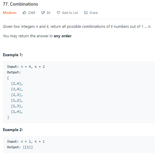 leetcode 77. Combiantion 문제입니다.