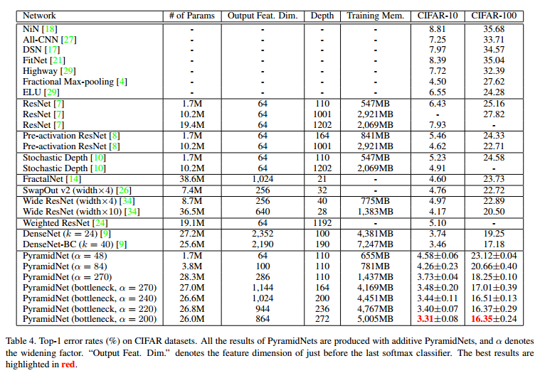 ImageNet과 CIFAR dataset 둘 다 additive PyramidNet이 multiplicative Pyramid보다 성능이 더 좋았습니다.
