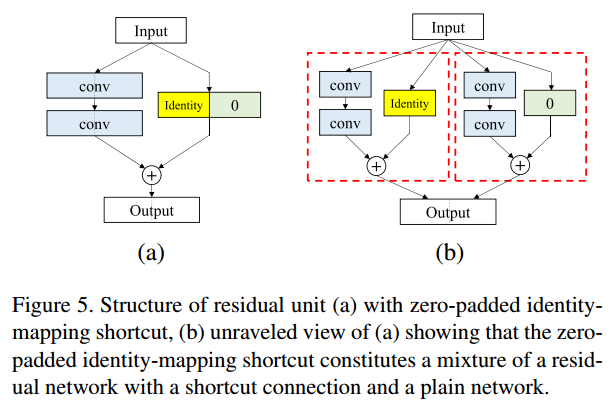 input 크기와 output 크기가 다르면 residual block을 이용할 수 없습니다. 둘의 크기를 맞추기 위해 zero-padded identity-mapping shortcut을 사용합니다. 저자는 zero-padded identity-mapping shortcut이 residual net + plain net을 혼합하는 효과가 있다고 추측합니다. 흥미롭네요ㅎㅎ 아래에 관련 내용을 요약해놨습니다.
