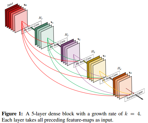 Dense Block 내의 레이어는 k개의 피쳐 맵을 생성합니다. 그리고 이 k를 Growth rate라고 부르는 하이퍼파라미터 입니다. 논문에서는 k=12를 사용합니다. l번째 레이어는 k0 + k * (l-1) 개의 입력값을 갖습니다. k0은 입력 레이어의 채널 수 입니다. 이 Growth rate는 각 레이어가 전체에 어느 정도 기여를 할지 결정합니다.