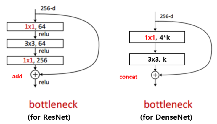 DenseNet은 Bottleneck layer를 사용합니다. 보틀넥 레이어는 3x3 conv의 입력값 채널을 조절하여 연산량에 이점을 얻기 위해 사용됩니다. 1x1 conv는 3x3 conv의 입력값을 4k로 조절합니다. 그리고 3x3 conv는 k개의 피쳐맵을 생성하고 이전 레이어와 연결됩니다.