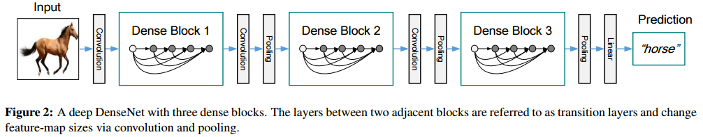 아래 그림을 보면 DenseNet은 3개의 Dense Block과 2개의 transition layer로 이루어져 있습니다.