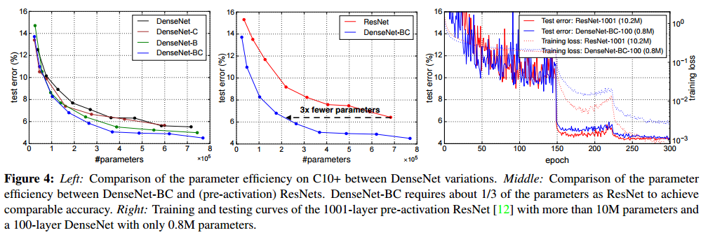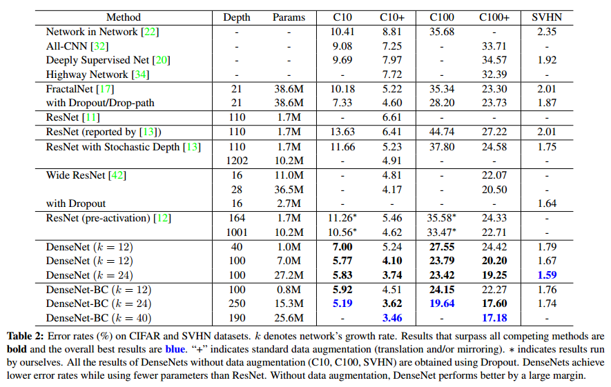CIFAR10, CIFAR100, SVHN dataset에 대한 DenseNet의 성능입니다. C10은 CIFAR10, C10+은 data augmentation이 적용된 것을 의미합니다.