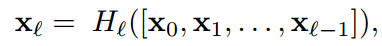 위 수식 처럼 이전 레이어 $x_0, ... , x_{l-1}$가 다 결합되어 H() 연산을 수행합니다. DensNet에서 H() 함수는 BN, ReLU, 3x3 conv입니다. pre-activation resnet의 순서를 따랐습니다.