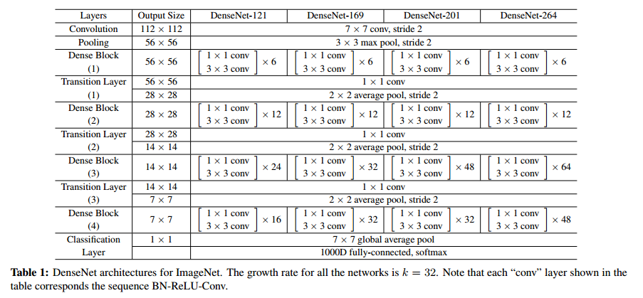 ImageNet dataset에 대한 DenseNet의 전체 구조입니다. ImageNet은 다른 데이터 셋에비해 이미지 사이즈가 크기 때문에 다른 구조를 갖습니다. ImageNet에서는 k=32를 사용합니다. CIFAR-10, SVHN dataset에 대한 구조는 논문에 안나와 있네요.
