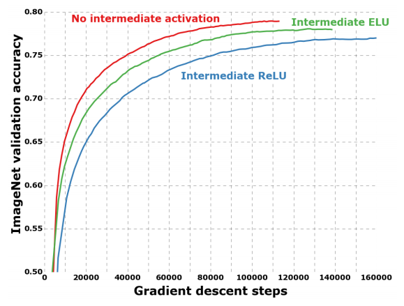 (2) 비선형 함수의 존재 유무입니다. Inception 모듈은 1x1 conv 이후에 ReLU 비선형 함수를 수행합니다. 하지만 Xception에서 사용하는 모듈은 비선형 함수를 사용하지 않습니다. 아래는 실험 결과입니다.