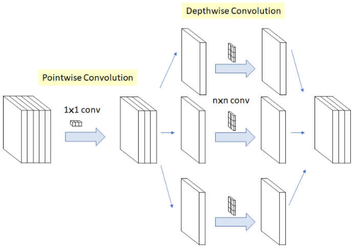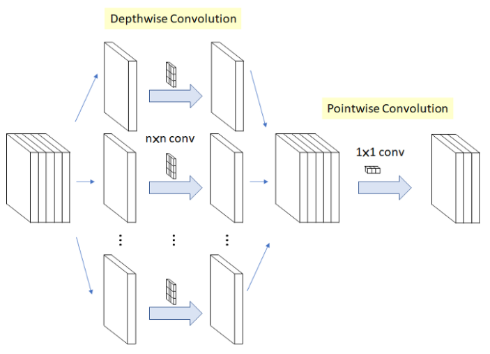 Depthwise Convolution은 입력 채널 각각에 독립적으로 3x3 conv를 수행합니다. 입력 채널이 5개이면 5개의 3x3 conv가 연산을 수행하여, 각각 입력값과 동일한 크기 피쳐맵을 생성합니다. 그리고 각 피쳐맵을 연결하여 5개 채널의 피쳐맵을 생성합니다. Pointwise Convolution은 모든 채널에 1x1 conv를 수행하여, 채널 수를 조절하는 역할을 합니다. 이렇게 연산을 수행하면 연산량이 감소합니다.