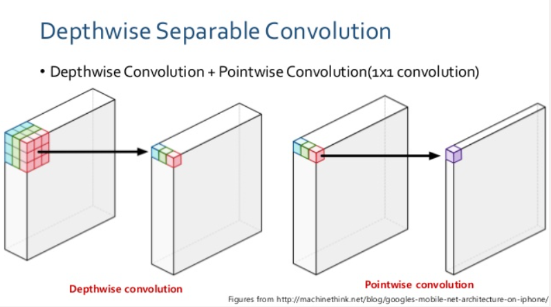 다음에는 Inception 모듈과 작동방식이 비슷한 Depthwise Separable Convolution을 소개합니다. Depthwise Separable Convolution은 Depthwise Convolution 이후에 Pointwise Convolution을 수행합니다. 두 가지 그림을 가져왔습니다.