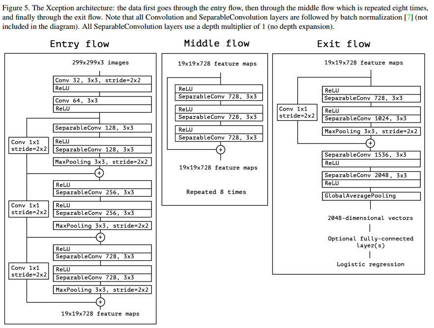 그리고 Xception은 Depthwise Separable Convolution을 수정해서 Inception 모듈 대신에 사용합니다.