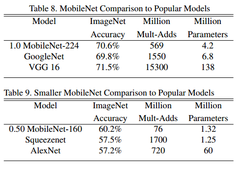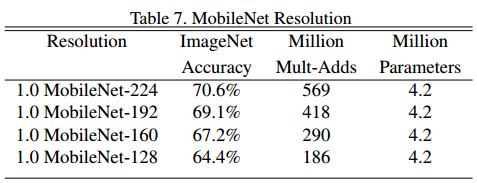 두 번째 하이퍼파라미터는 Resolution Multiplier $\rho$ 입니다. 모델의 연산량을 감소시키기 위해 사용합니다. $\rho$는 입력 이미지에 적용하여 해상도를 낮춥니다. 범위는 0~1이고, 논문에서는 입력 이미지 크기가 224, 192, 169, 128 일때 비교를 합니다. 기본 MobileNet은 $\rho$=1을 사용합니다.