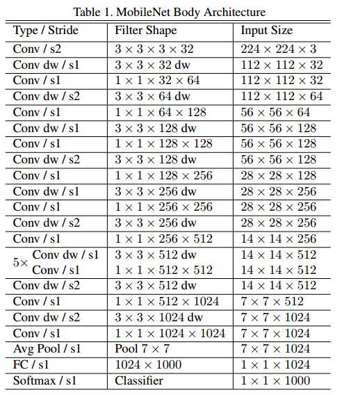 첫 번째 conv를 제외하고 depthwise separabel convolution을 사용합니다. 마지막 FC 레이어를 제외하고 모든 레이어에 BN, ReLU를 사용합니다. Down-sampling은 depthwise convolution과 첫 번째 conv layer에서 수행합니다. 총 28 레이어를 갖습니다.