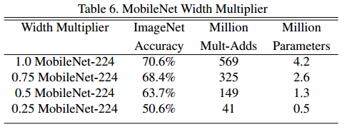 $\alpha$는 0~1 범위이고 기본 MobileNet은 1을 사용합니다. Width Multiplier를 낮추면 모델의 파라미터 수가 감소합니다.