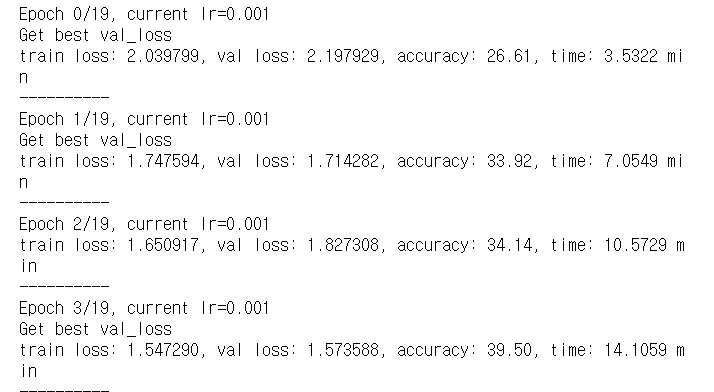 학습을 시작합니다. 저는 20epoch만 진행하겠습니다. 코랩 환경에서 진행하다보니 끊기는 경우가 종종 있어서 오랫 동안 학습하기가 불안하네요..ㅎㅎ