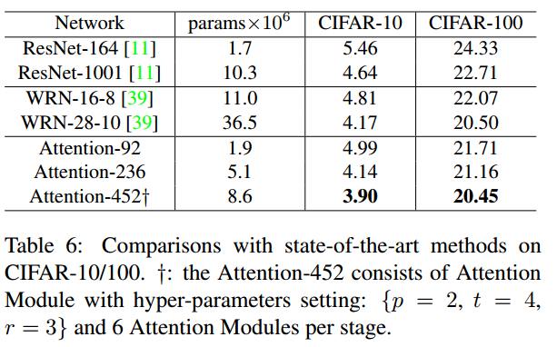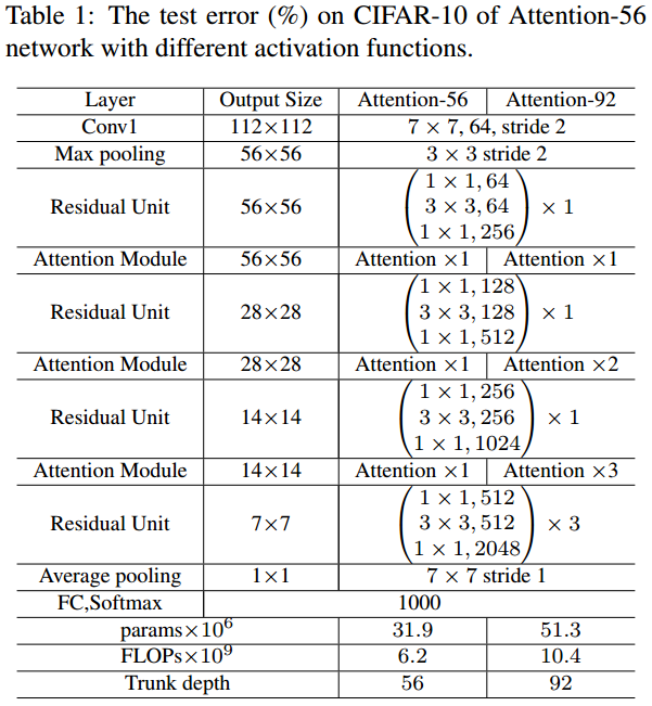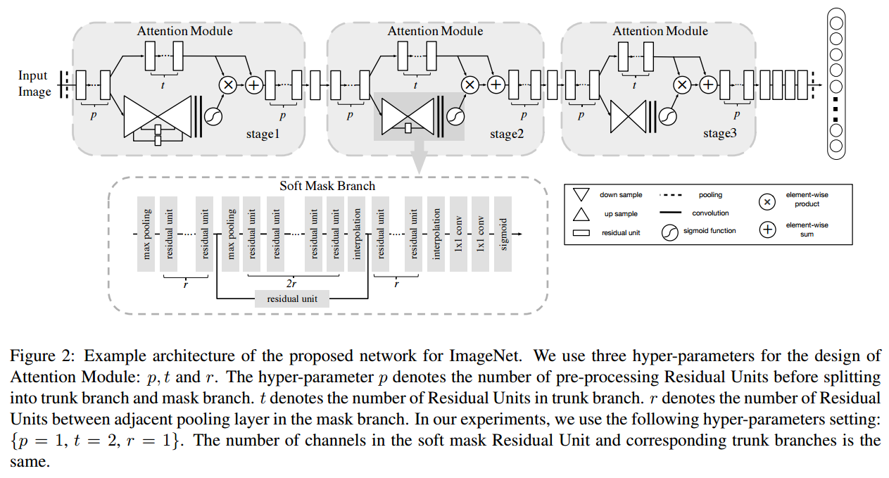 Residual Attention Network Architecture은 Attention module을 쌓은 것입니다. Attention 모듈은 하나의 특징만 포착하기 때문에 여러 모듈을 쌓아서 사용해야 합니다. 그리고 세 개의 하이퍼파라미터가 존재합니다. p, t, r은 각 파트에서 사용하는 residual unit의 개수를 의미합니다. 논문에서는 1,2,1 을 사용합니다.