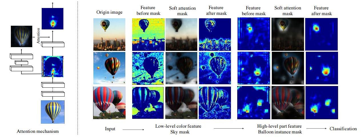 위 그림을 보면 기존 이미지에서 생성한 피쳐맵이 Soft attention mask와 곱해져 배경을 제거했습니다. 중요하지 않은 정보라고 판단하여 배경을 제거한 것입니다. 그리고 high-level에서는 feature map이 마스크와 곱해져 풍선 픽셀을 정제합니다.