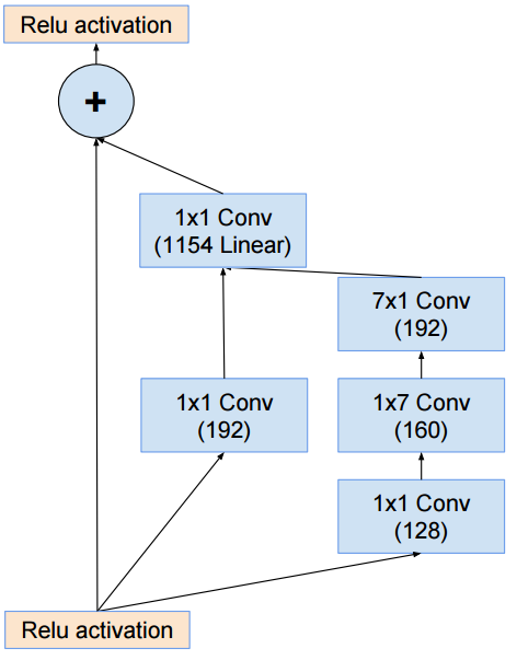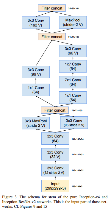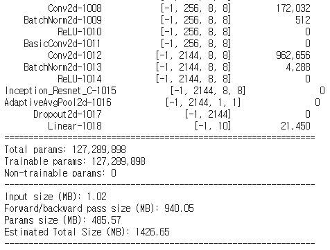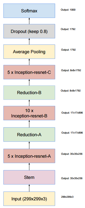 Inception-ResNet-v2 구조는 다음과 같습니다. 아래 그림에서 출력값은 Inception-ResNet-v1 기준이므로, v2 출력값은 논문을 확인해야 합니다.