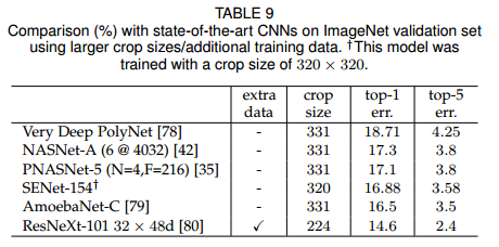 state-of-the-art와 SENet 비교입니다. SENet의 backbone은 ResNext를 사용했습니다.