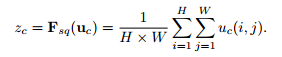 Squeeze는 conv 연산을 통해 생성된 피쳐맵을 입력으로 받습니다. HxWxC 크기의 피쳐맵을 global average pooling 연산을 통해 (1x1xC)로 압축합니다. 피처맵의 한 채널에 해당하는 픽셀 값을 모두 다 더한 다음에, HXW로 나누어 1x1x1로 압축합니다. 피쳐맵은 C개의 채널을 갖고 있으므로 다 연결하면 (1x1xC)가 됩니다.