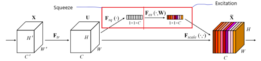 SE Block을 살펴보겠습니다. SE Block은 Squeeze(압축), Excitation(재조정) 두 과정으로 구성됩니다.