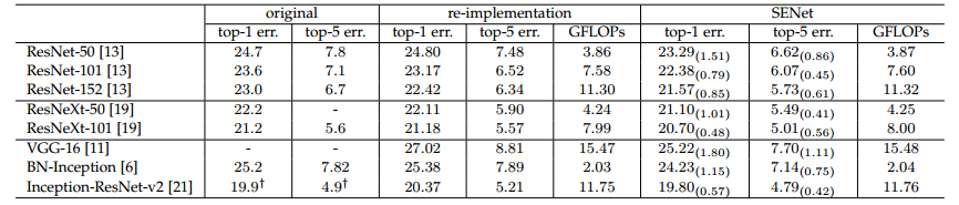 여러 모델에 SE Block을 부착했을 때와 부착하지 않았을 때의 성능을 비교합니다.