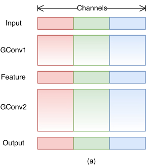 Pointwise Group Convolution은 1x1 Pointwise Convolution의 연산량을 감소시키기 위해서 제안되었습니다. 아래 그림이 1x1 pointwise group convolution입니다. 첫 번째 1x1 Conv에서 입력 채널을 그룹으로 나눠서 연산을 하네요.