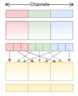Channel Shuffle은 3x3 convolution이 서로 다른 그룹에서 입력값을 받도록 합니다. 아래 그림을 살펴보겠습니다. 모든 입력 채널 그룹이 3x3 conv로 전달되네요. 따라서 3x3 conv는 모든 입력 그룹에 해당하는 정보를 활용하여 출력값을 생성합니다.