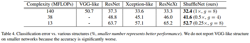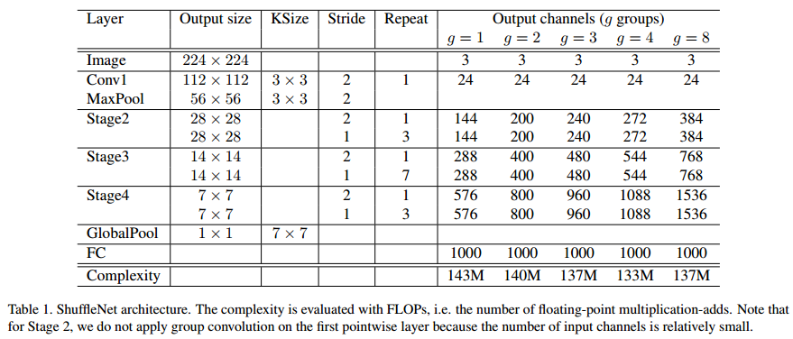 다음은 ShuffleNet 구조입니다. ShuffleNet unit이 3개의 stage에 묶여있네요. 다음 stage로 넘어갈 때마다 채널 수가 2배가 됩니다. 그리고, bottleneck 채널을 출력 채널 수의 1/4로 설정합니다.
