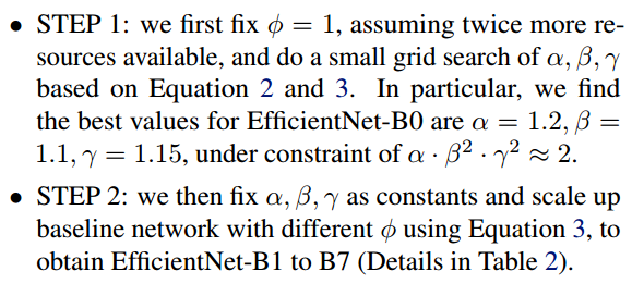 $\alpha, \beta, \gamma$는 small grid search로 결정되는 상수입니다. 그리고, $\phi$는 주어진 연산량에 따라 사용자가 결정하는 상수입니다. FLOPs는 너비와 해상도에 따라 제곱배가 상승합니다. 너비를 2배 키우면 FLOPs는 4배가 증가하는 것입니다. 따라서 FLOPs는 $(\alpha \cdot \beta^2 \cdot \gamma^2)^2$ 배 만큼 증가합니다. 논문에서는 $\alpha \cdot \beta^2 \cdot \gamma^2 = 2$로 제한합니다. 제한된 범위에서 $\alpha, \beta, \gamma$를 찾는 것입니다. 총 FLOPs는 $2^{\phi}$ 만큼 증가합니다.