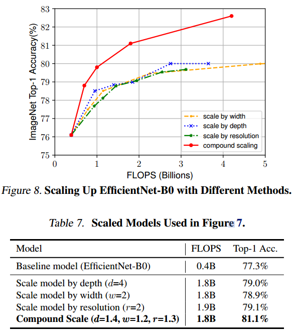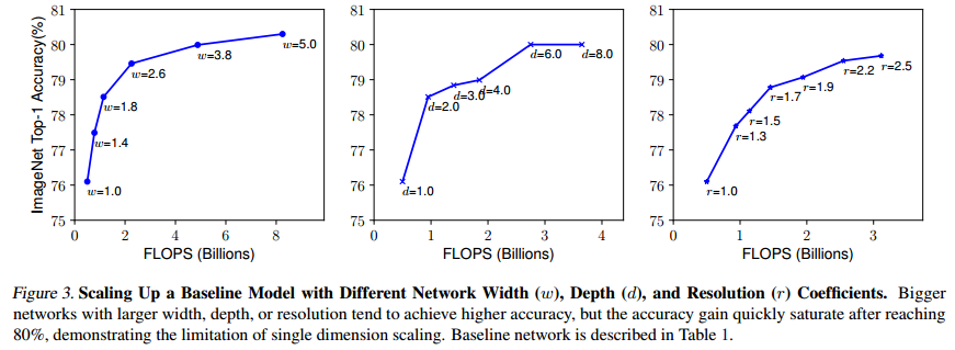 w(너비), d(깊이), r(입력 해상도)에 따른 정확도 값입니다. 그림을 보면 w, d, r이 일정 값 이상이 되면 정확도가 빠르게 saturate 합니다. 그리고, w, d, r이 낮을 때는 약간만 값을 조절해도 효과가 크네요. w, d, r 중 하나만 조절하는 것보다 d와 r을 함께 조절하여 최고의 효율을 찾아내는 것이 Compound Scailing 입니다.